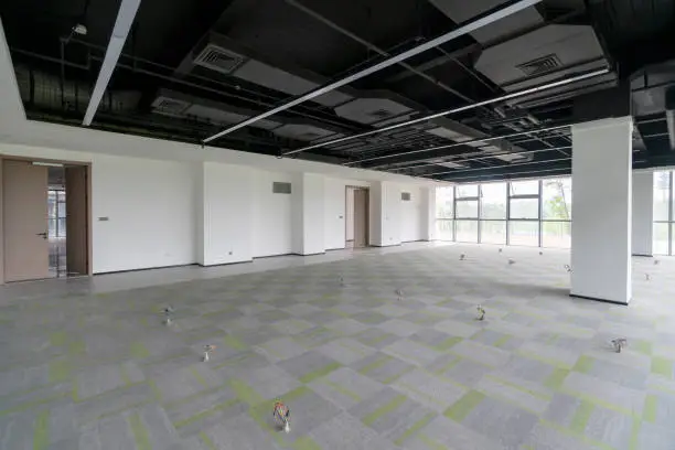 Transformation complète d'un espace commercial avec cloisons et plafonds.